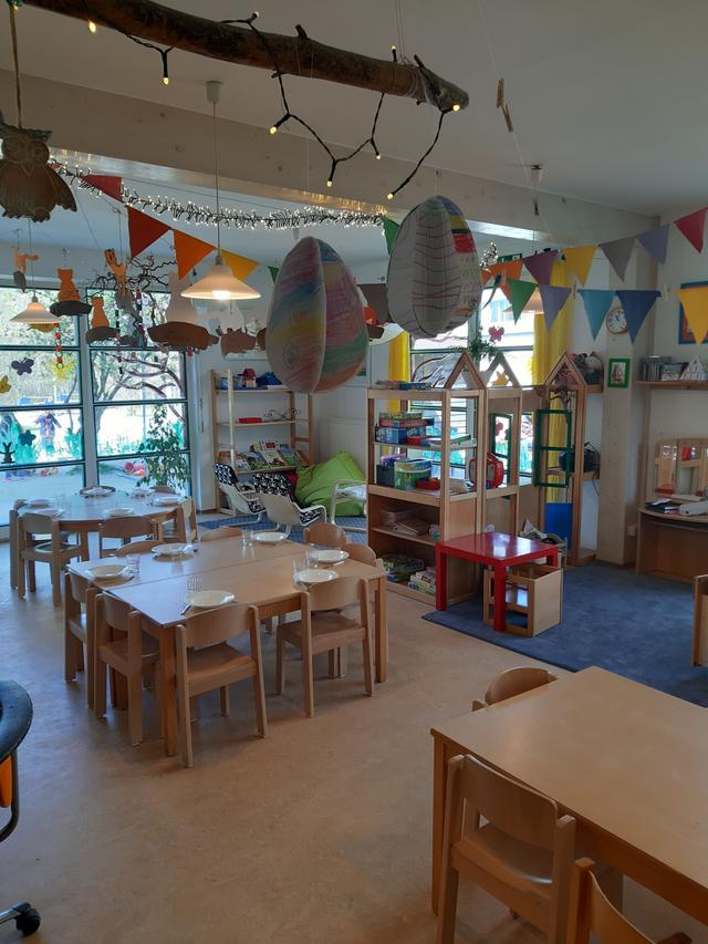 Wir haben einen großen Garten, der viele Möglichkeiten zum Entdecken, Bewegen und Spielen bietet. Darin befindet sich ein Hügel, der im Winter zum Schlittenfahren genutzt wird, ein Sand- und Wasserspielbereich, Spielgeräte und eine Brettschaukel.