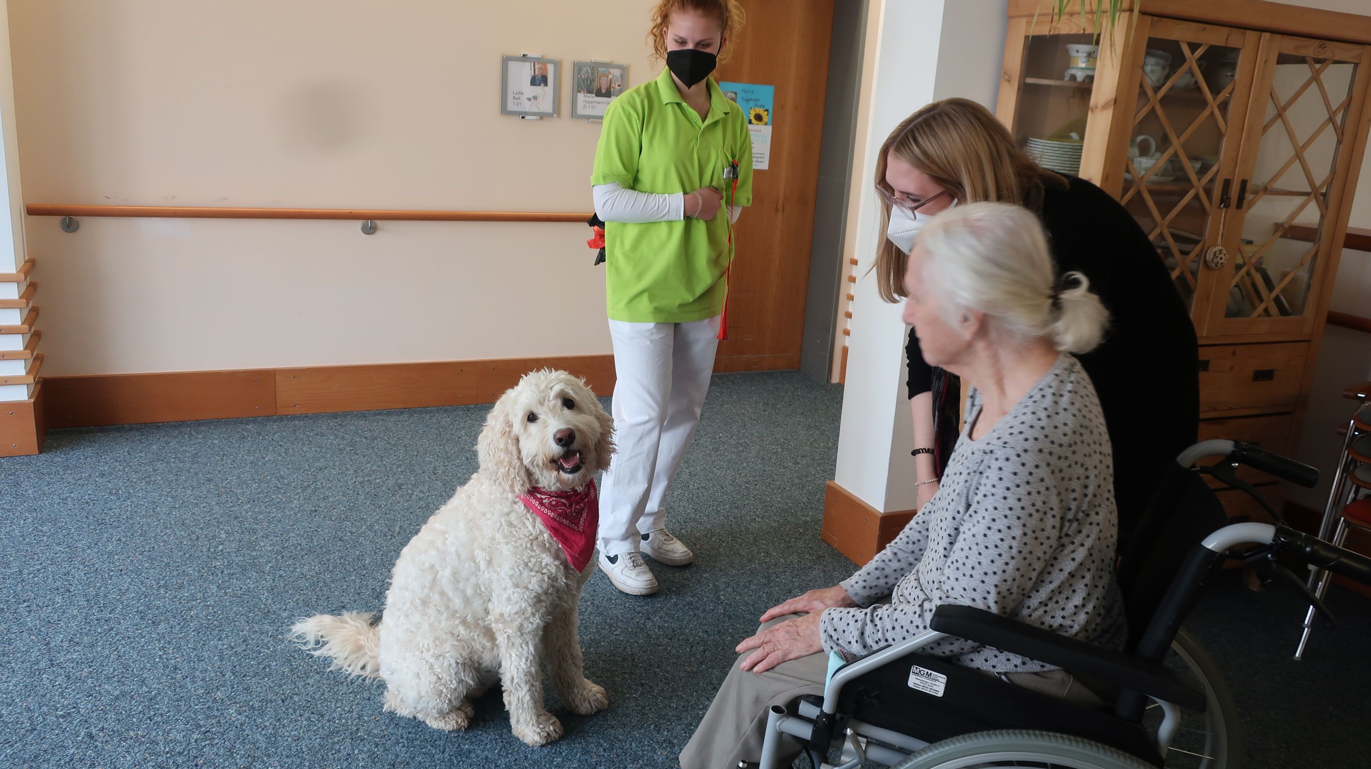 Aber es wird nicht nur entspannt in diesen Tagen. Im Seniorenzentrum hatten wir „kuschligen“ Besuch. Die Hundedame „Lumi“ mit unserer neuen Fachoberschulpraktikantin Annika, spazierte vormittags durchs Haus. Es ist immer wieder faszinierend, wie ein weiches, kuschliges und ruhiges Tier, ein „Türöffner“ für unsere Senior*innen mit Demenz ist, die in dieser Situation wieder Wörter finden, die sie längst vergessen haben, und sich emotional öffnen. Die Bewohner*innen genießen offensichtlich das Miteinander. Bei den Tieren dürfen sie einfach nur „Sein“, mit all ihren Defiziten und Ängsten. Dabei entstehen nette Ausdrücke wie:“ Hunde sind das Beste was es gibt.“