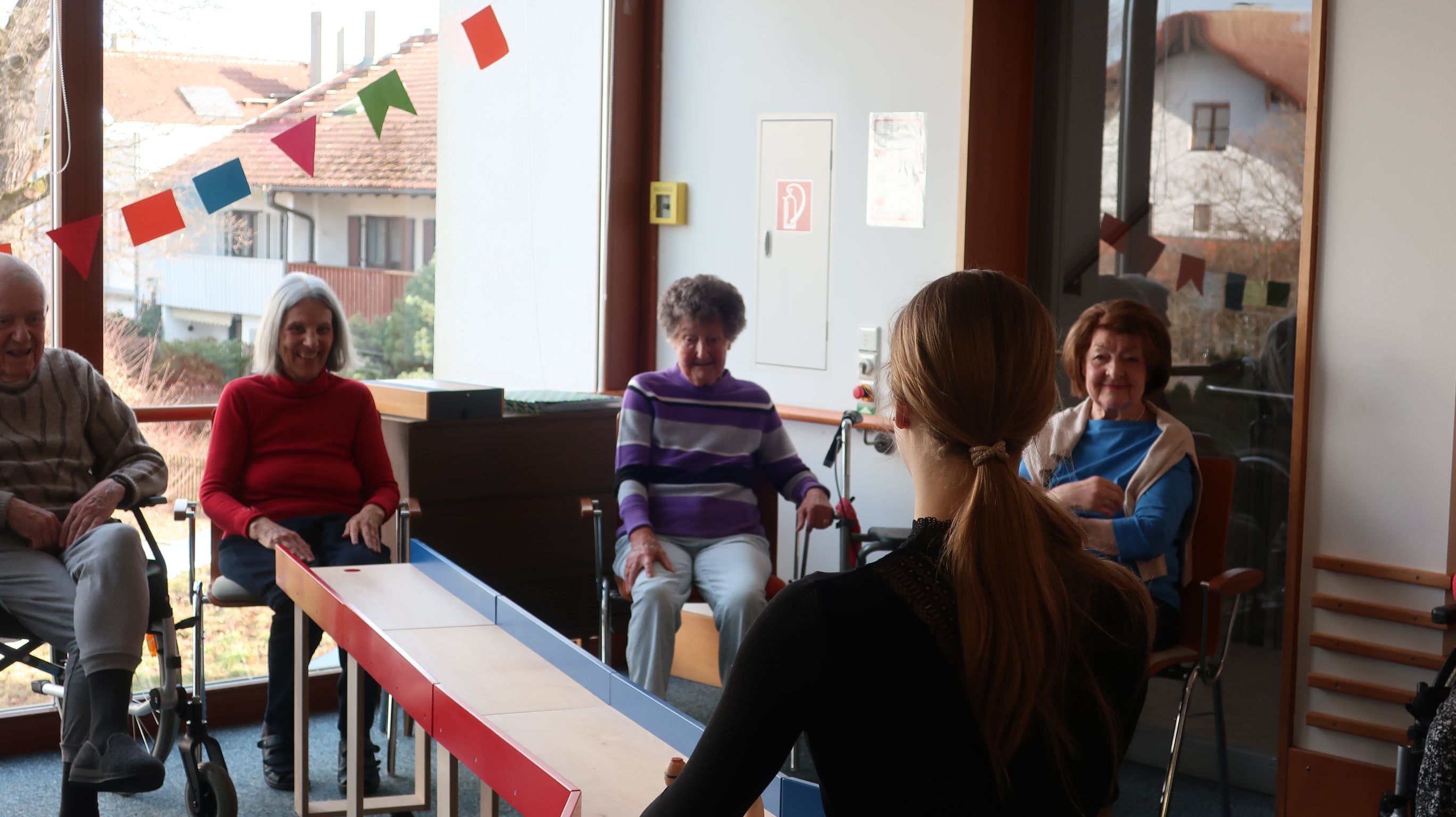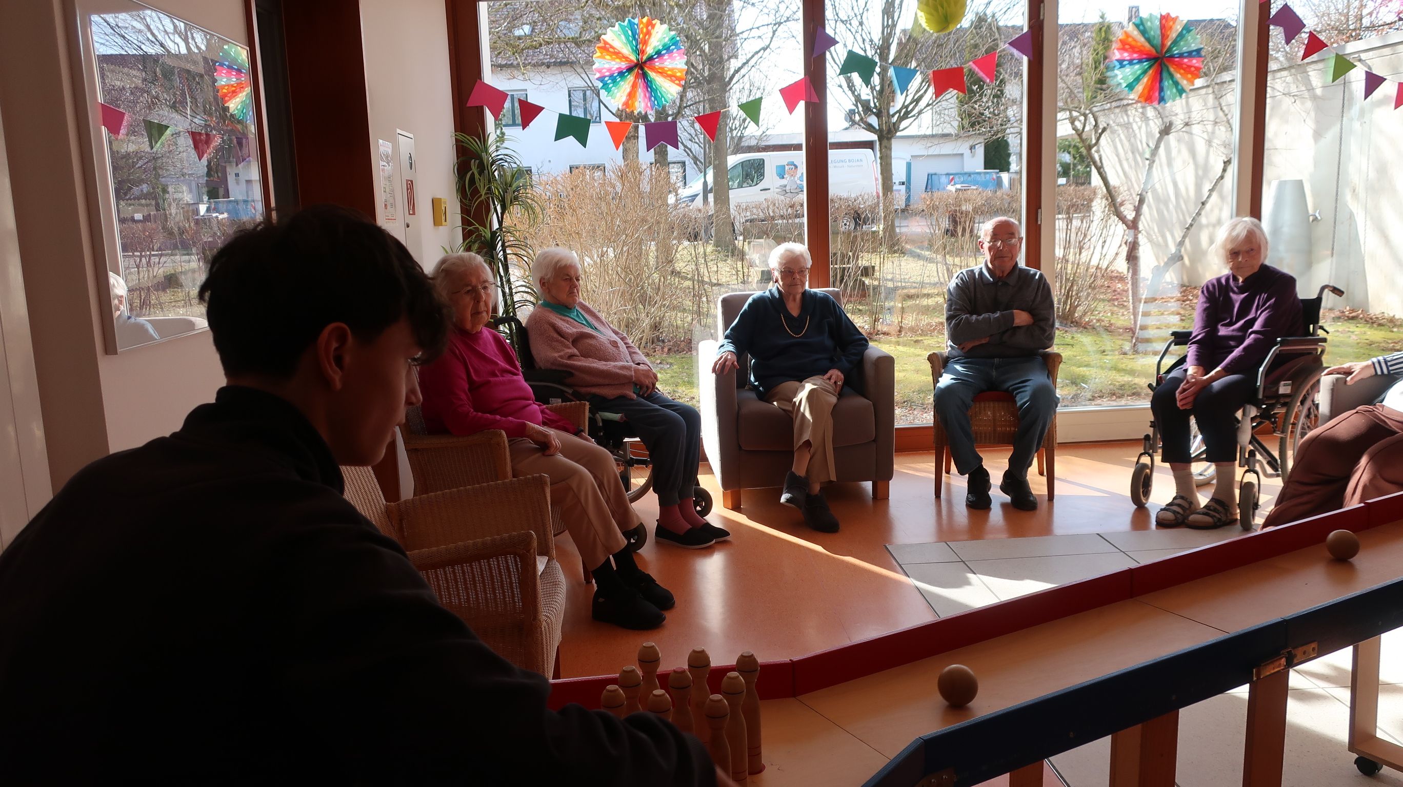 Zu unseren täglichen Aufgaben gehörten, z.B. die Einzelbetreuung der Bewohner*innen, wie Gesellschaftsspiele spielen, Unterhaltung oder auch spazieren gehen. Wir halfen auch bei den Gruppenaktivitäten, wie Kegeln, Singen oder auch Gymnastik. Außerdem unterstützen wir die Senior*innen beim Frühstück und Mittagessen.