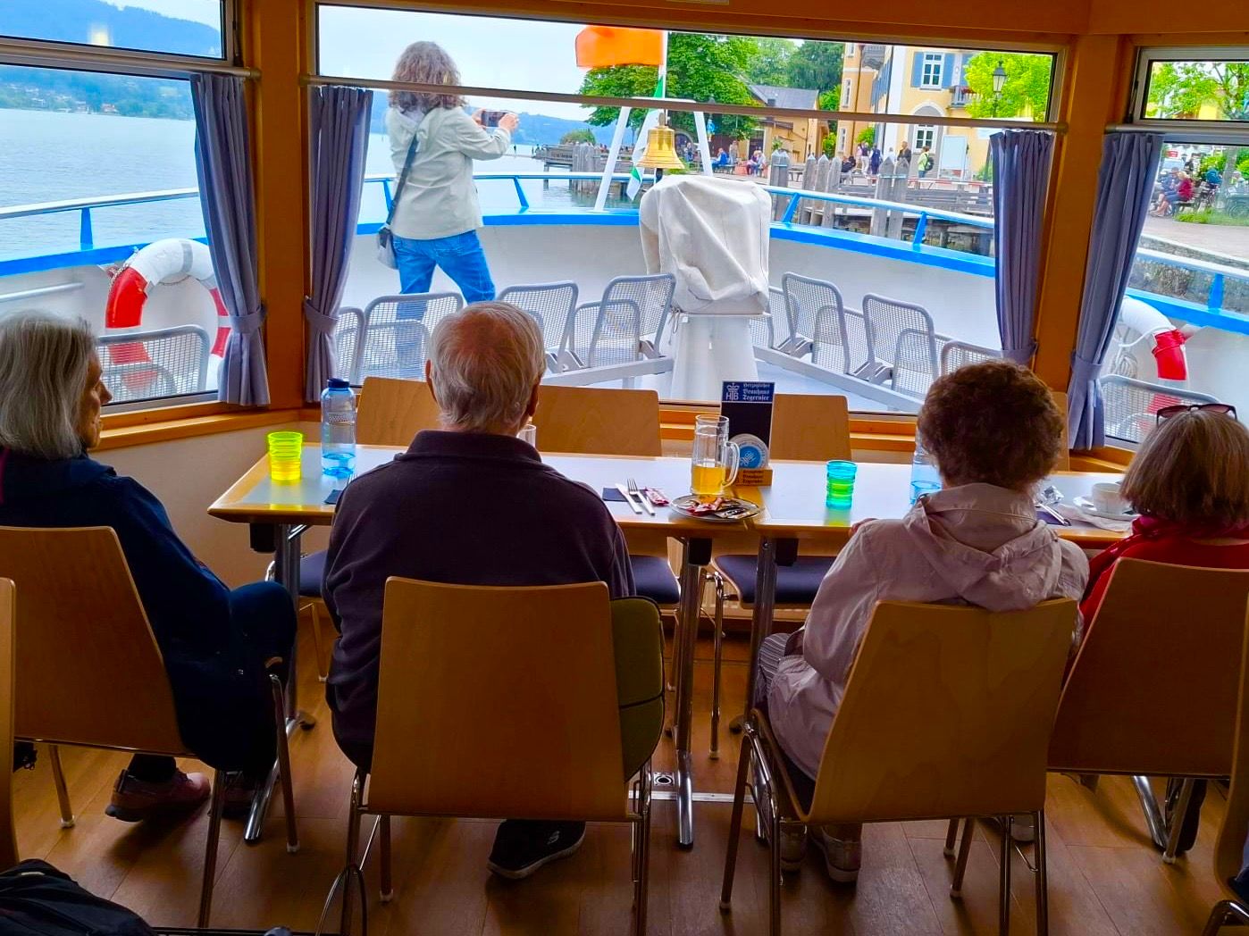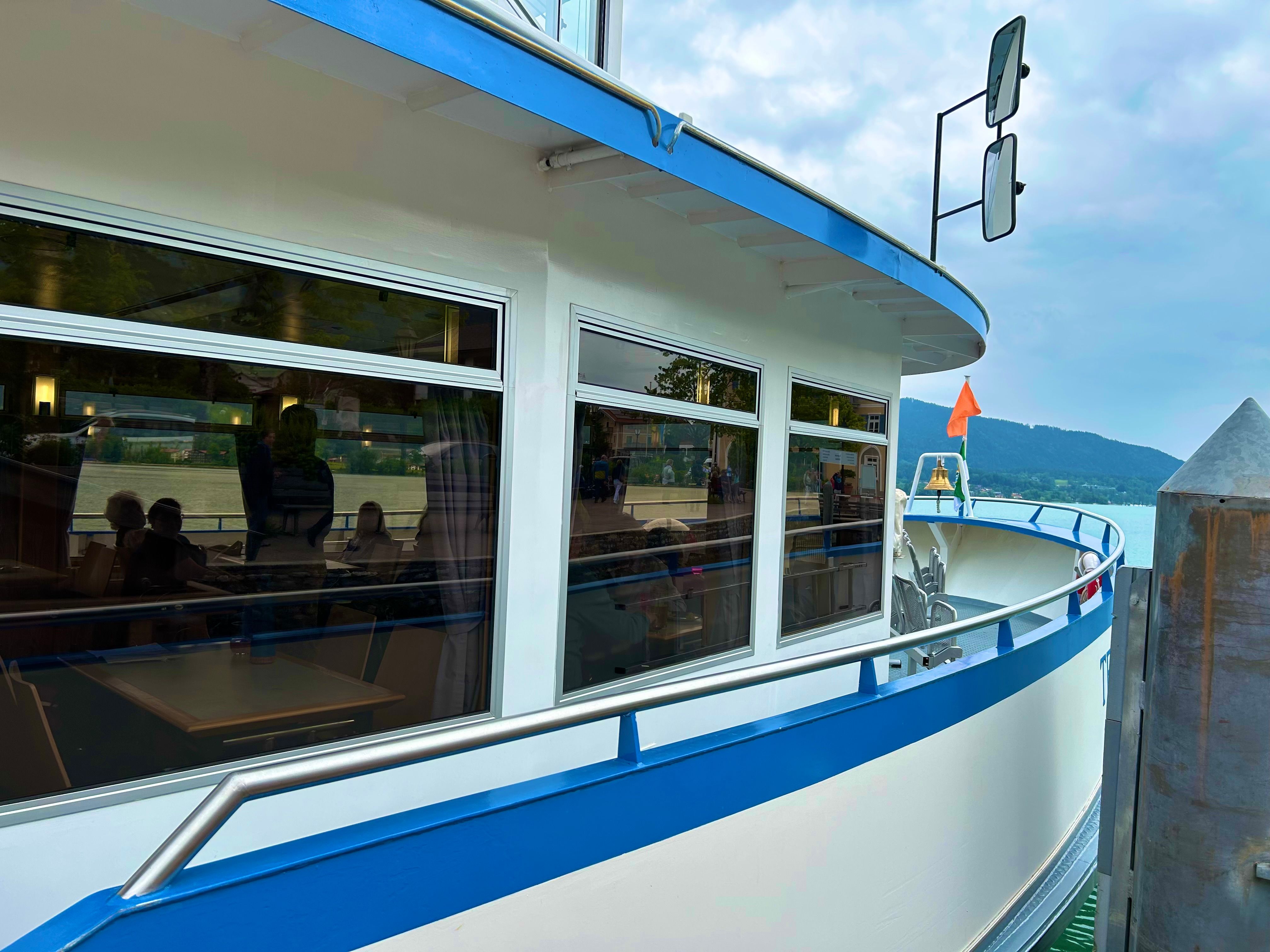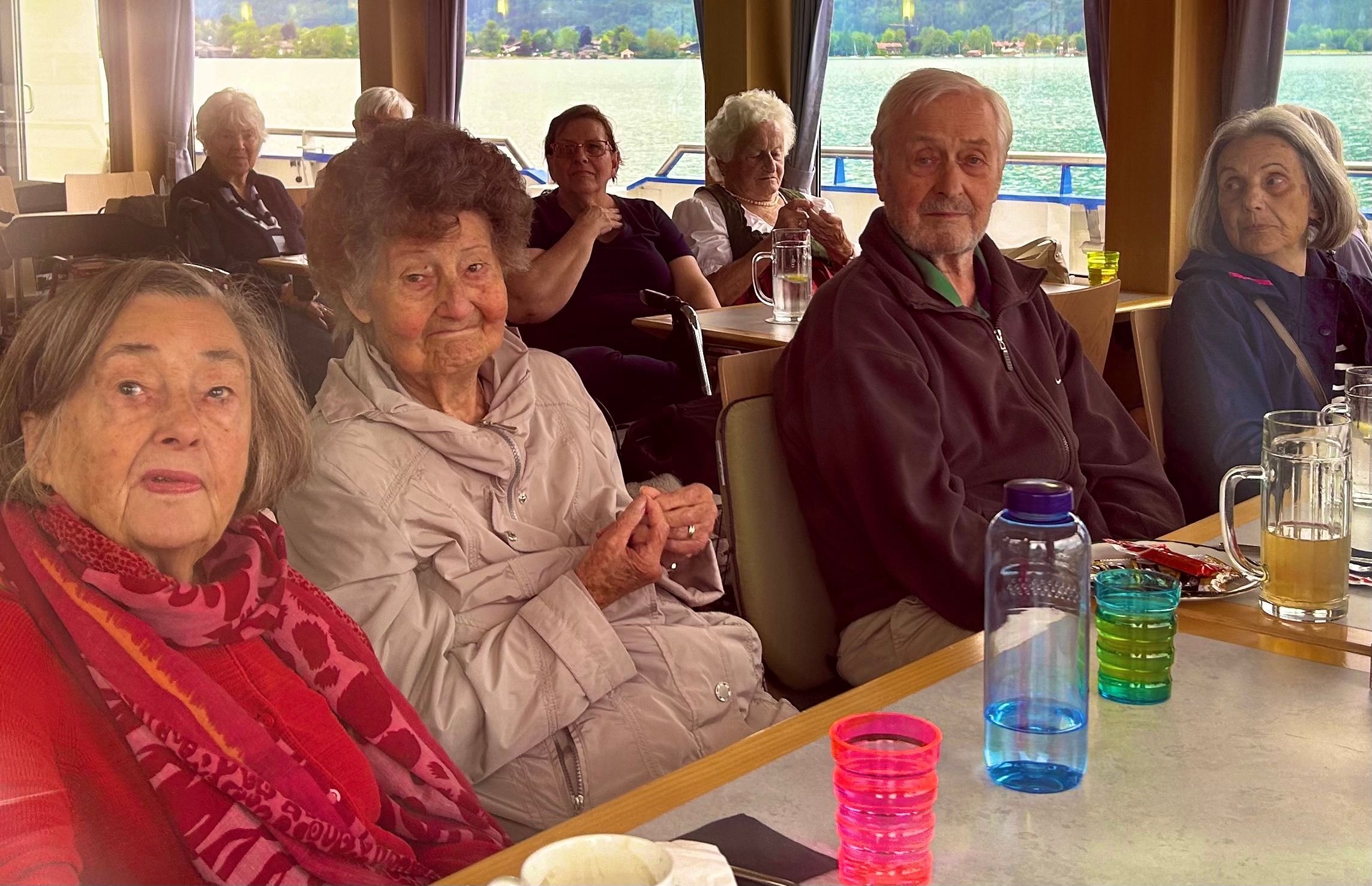 Somit war unser diesjähriges Ausflugsziel, eine Schifffahrt am Tegernsee. Pünktlich um 10.00 Uhr ging es mit dem Gemeindebus nach Bad Wiessee, wobei schon die ersten Erinnerungen an frühere Ausflugsfahrten zum Gespräch wurden und ein munteres miteinander im Bus entstand. Gut gelaunt und mit Hilfe unseren umsichtigen und einfühlsamen ehrenamtlichen Mitarbeiter*innen bestiegen wir das Ausflugsschiff mit neunzigminütiger Rundfahrt um den Tegernsee. Wir konnten in gemütlicher Runde an Deck einen herrlichen Ausblick auf den blaugrün schimmernden See und die malerischen Uferorte, wie das Tegernseer Kloster und die schönen Berge genießen. Aber nicht nur visuell war es ein "Highlight", auch gustatorisch, mit Flammkuchen und Weißwürste.