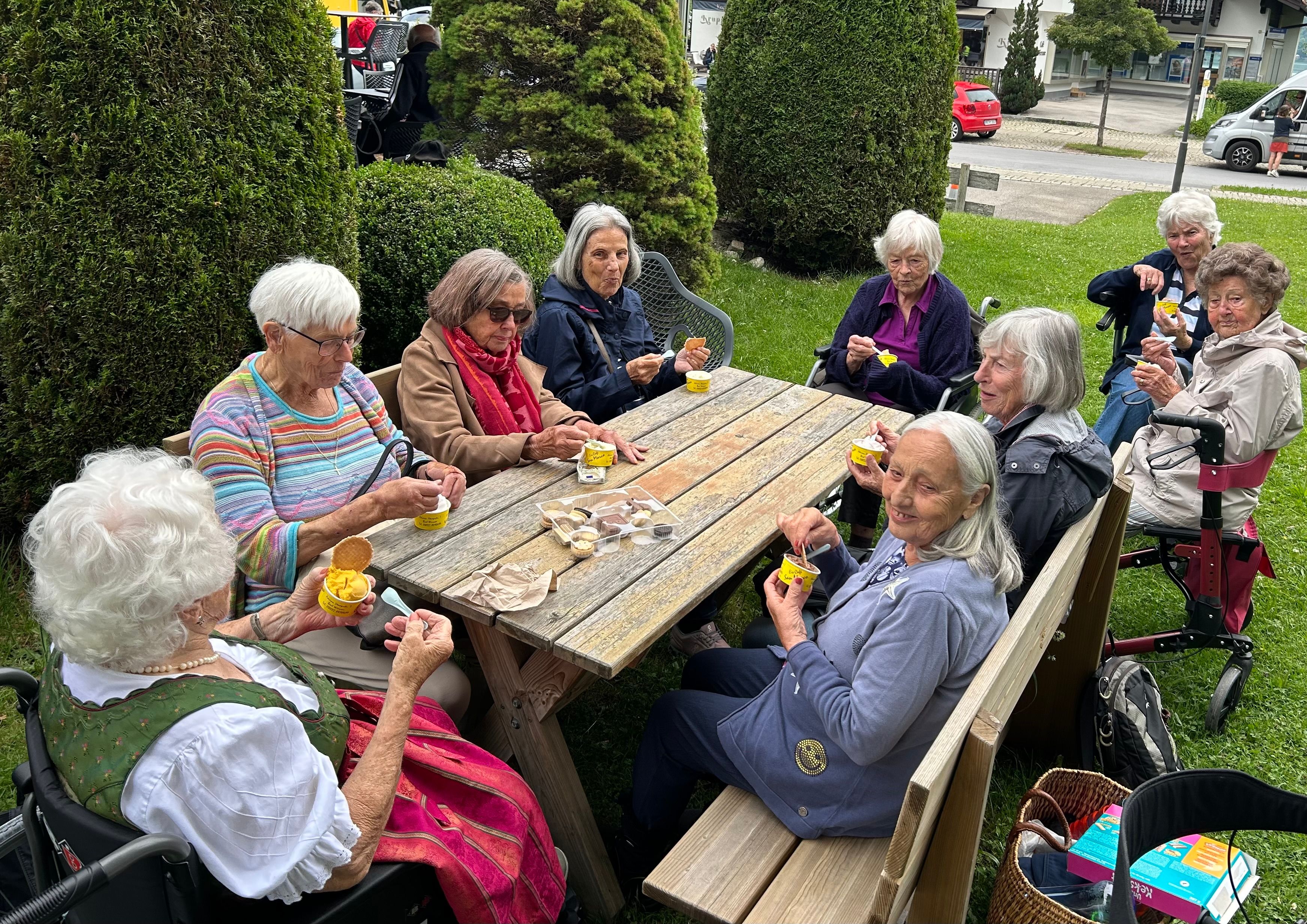 Mit unseren Senior*innen in die Eisdiele nach Sauerlach oder unseren monatlichen Rollstuhlausflug, all das macht unsere Bewohner*innen glücklich und sie blühen sichtlich auf.